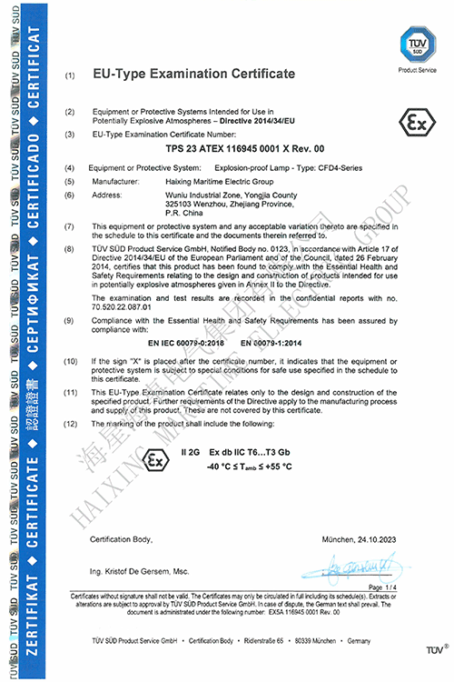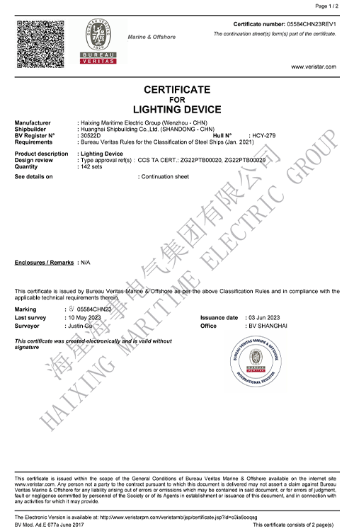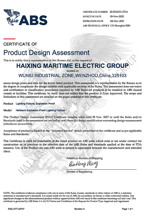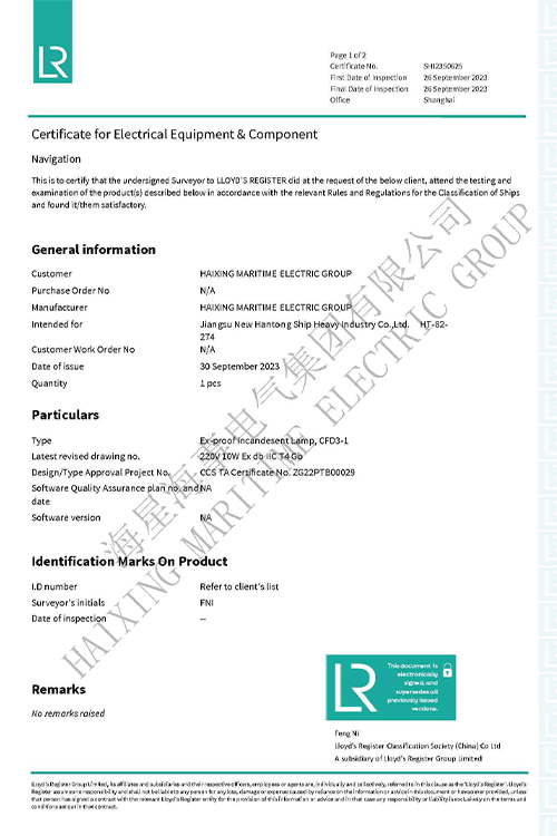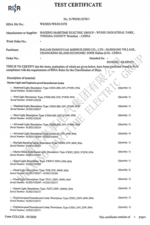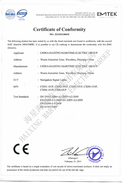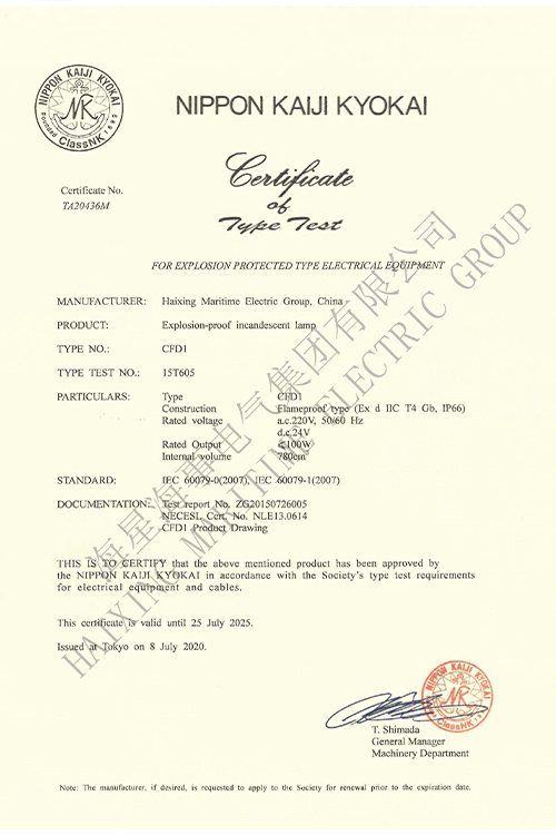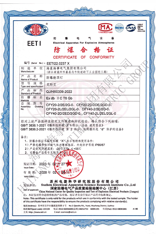 公司现有产品均通过国家灯具质量监督中心、国家电器产品质量监督检验中心和福建省产品质量检验研究院的检测合格,获得国家防爆电气检测中心防爆合格证,并获得多个国家船级社认证和国际防爆认证。