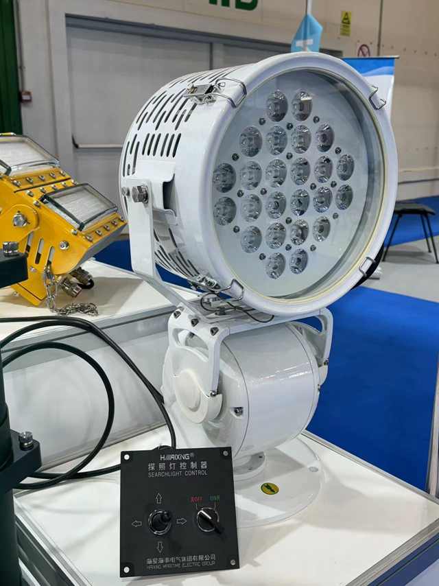 此次参加希腊国际海事展览会,公司精心挑选展出了新产品“LED新型探照灯TZ8-A”。该产品主要适用于船舶、舰艇、夜间航行作远距离搜索照明用,同时适用于码头、建筑工地、堆货场等露天场所作投光照明。产品具有节能、高效、照射距离远等特点。