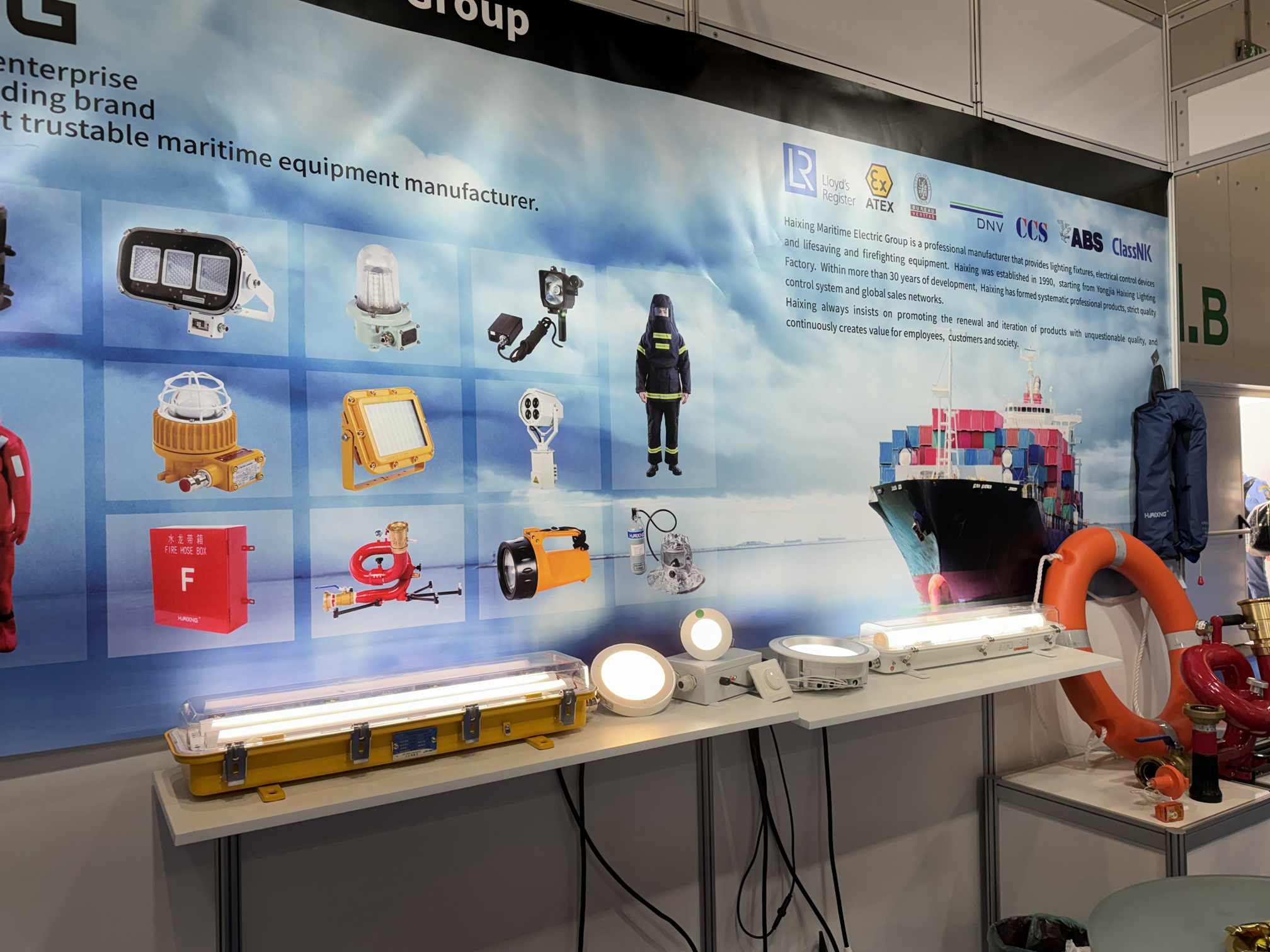 同时展出了LED航行信号灯、LED投光灯、LED舱顶灯、LED光源模组、驱动电源、防水电缆锁头,以及救生/消防等海事与船舶配套产品数10种。