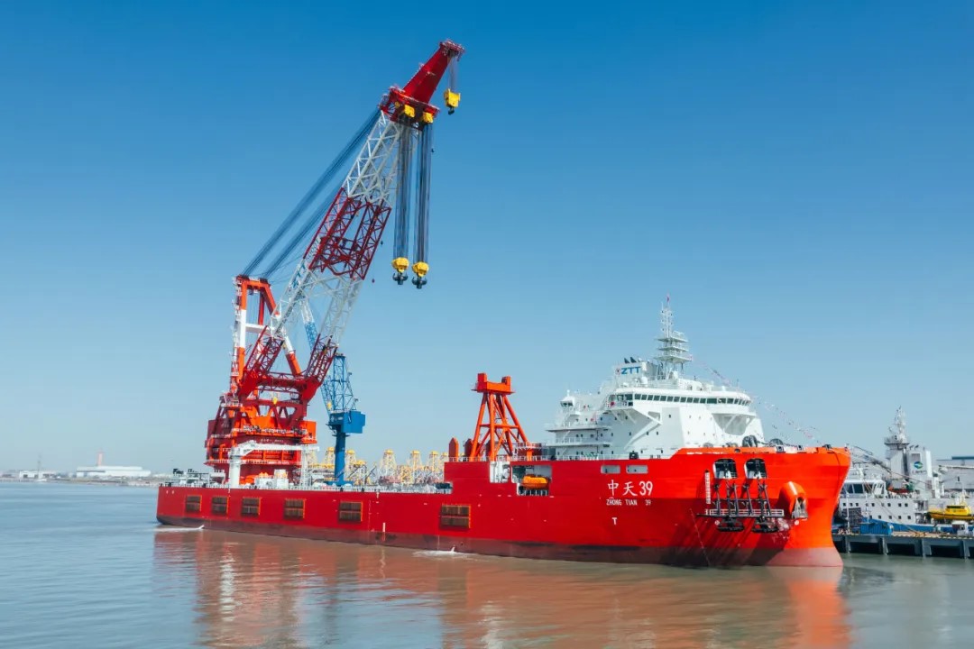 4月18日,上海振华重工为立洋海工建造的国内领先、国际一流的5000吨自航式全回转起重船“中天39”在启东海洋工程举行命名暨交付仪式。