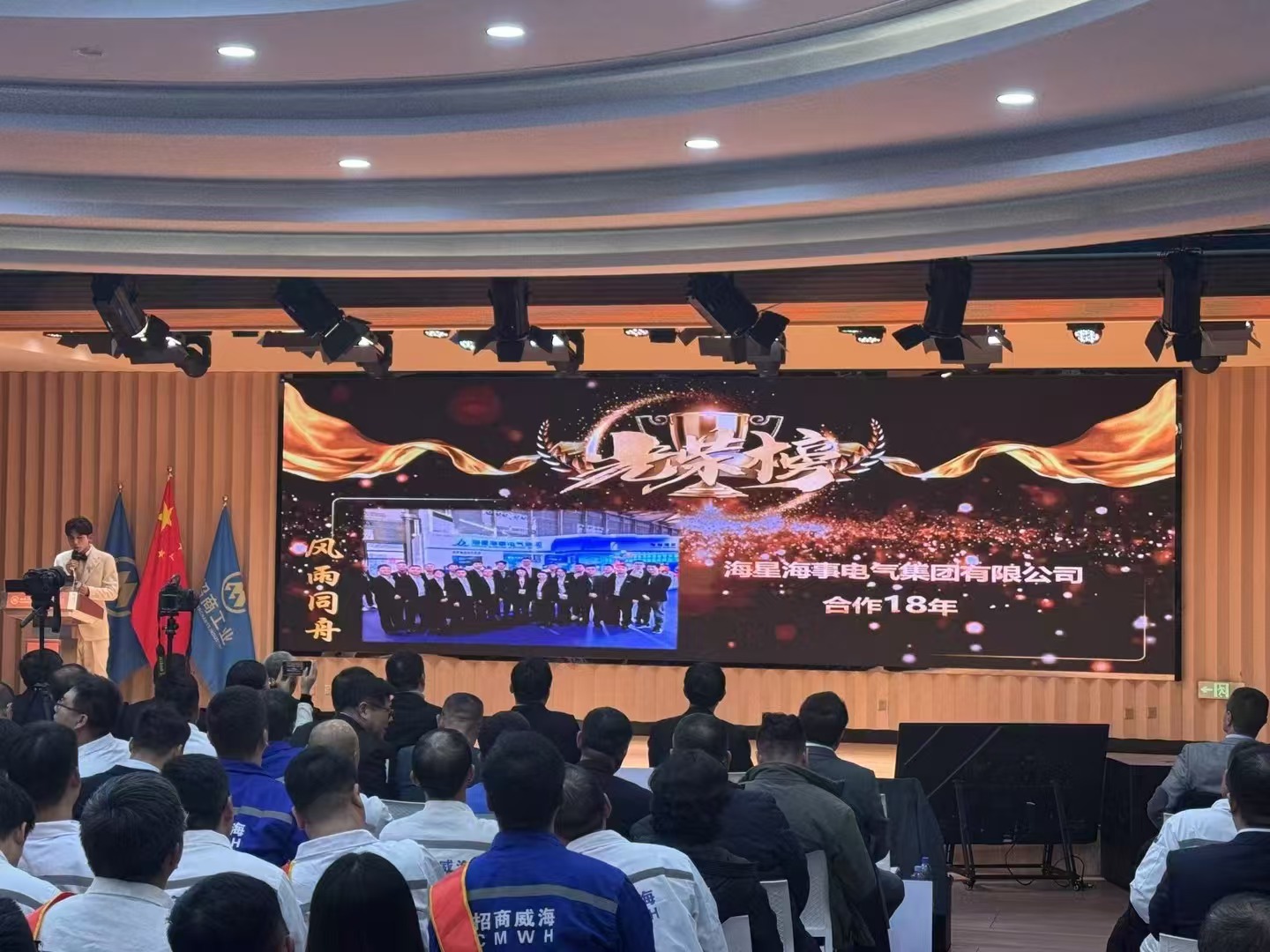 招商局金陵船舶(威海)有限公司与海星海事电气集团风雨同舟18余载,已建立深厚的合作关系。2024年海星集团先后为招商局金陵船舶(威海)有限公司3艘瑞典STENA船东高端豪华客滚船 、6艘新加坡东太平洋航运公司(EPS)的7000 车双燃料汽车滚装船以及 5座华科五洲(天津)海洋工程有限公司的自升自航式作业平台等诸多重大项目配套。此次获得“风雨同舟奖”的表彰,也代表了招商局金陵船舶(威海)有限公司对海星集团产品品质与服务的高度认可。