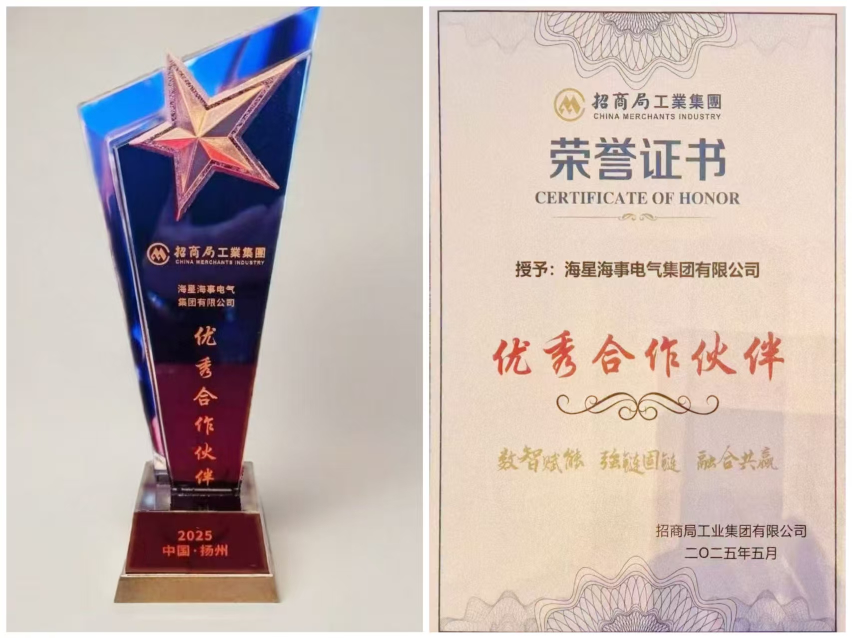 2025年5月9日,招商局工业集团有限公司第二届供应商大会在扬州盛大启幕。本次大会以“数智赋能,强链固链,融合共赢”为核心主题,聚焦数字化供应链体系建设,旨在通过深度交流与合作,携手合作伙伴共同探索行业发展新趋势,打造具有全球竞争力的高质量供应链生态。在众多优秀企业中,海星海事电气集团凭借卓越的产品品质、高效的服务体系及长期稳定的战略合作,脱颖而出,荣获“优秀合作伙伴”殊荣。